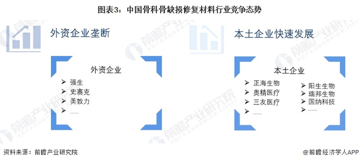 可以看出,当前我国骨科骨缺损修复材料行业呈现天然骨修复材料生产企业、人工骨修复材料生产企业两大派系并存,外资企业垄断、本土企业快速发展的格局。
