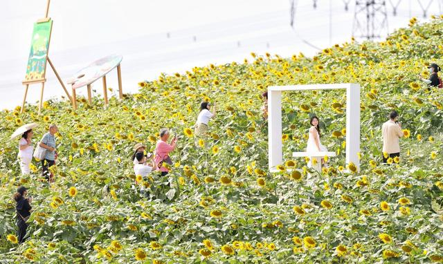 2023年9月20日,北京温榆河公园朝阳示范区西园,“芸上梯田”景区漫山的向日葵盛放,不少游客在其中拍照留念。 新京报记者 王飞 摄