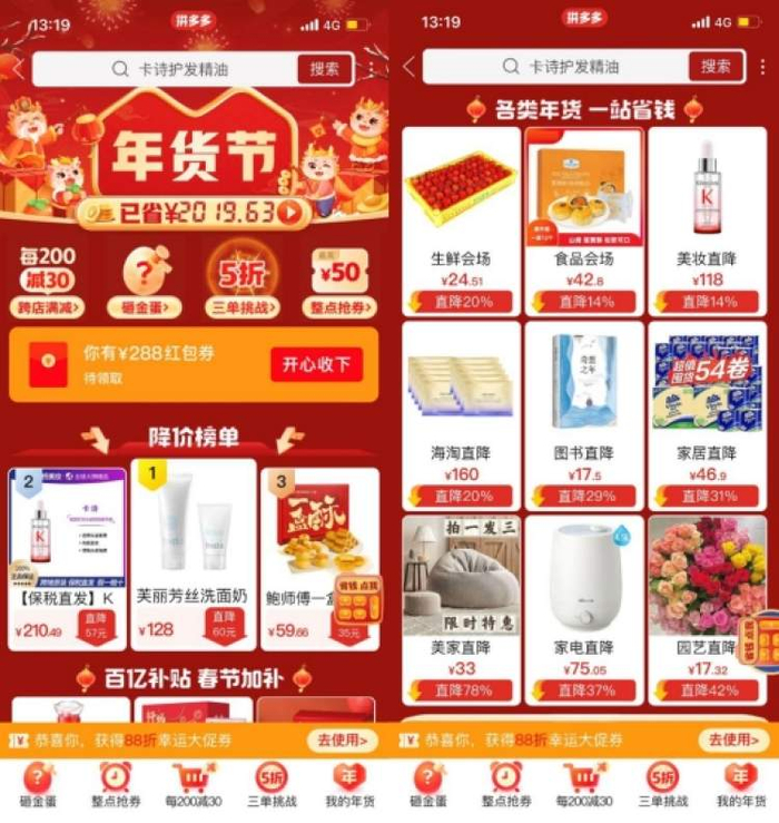 在拼多多客户端搜索“年货节”即可点击进入大促主会场。进入会场后,可领取优惠券,也有机会获得288元大促券,此外,会场内设置砸金蛋、三单挑战、整点抢券等活动。
