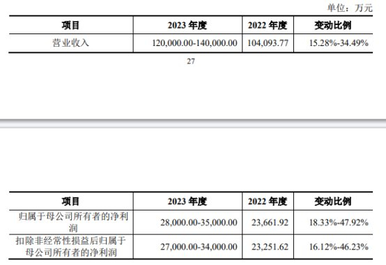 博隆技术结合当前的实际销售情况以及市场因素等多方面考虑,预计公司2023年营业收入为120,000.00万元至140,000.00万元,变动比例为15.28%至34.49%;预计归属于母公司所有者的净利润为28,000.00万元至35,000.00万元,变动比例为18.33%至47.92%;预计扣除非经常性损益后归属于母公司所有者的净利润为27,000.00万元至34,000.00万元,变动比例为16.12%至46.23%。