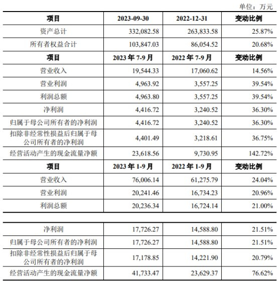 2023年1-9月,博隆技术营业收入为76,006.14万元,同比增长24.04%;净利润/归属于母公司所有者的净利润为17,726.27万元,同比增长21.51%;扣除非经常性损益后归属于母公司所有者的净利润为17,178.85万元,同比增长20.79%;经营活动产生的现金流量净额为41,733.47万元,同比增加76.62%。