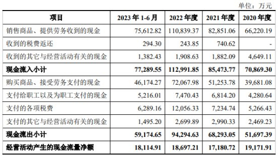 2020年至2023年1-6月,博隆技术销售商品、提供劳务收到的现金分别为66,220.19万元、82,851.06万元、110,839.37万元、75,612.82万元,经营活动产生的现金流量净额分别为19,171.91万元、17,180.72万元、18,697.21万元、18,114.91万元。
