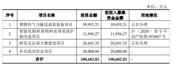 博隆技术本次发行募集资金总额120,790.82万元,募集资金净额为110,428.26万元,较原计划多9825.43万元。博隆技术2024年1月5日披露的招股书显示,公司拟募集资金100,602.83万元,计划用于聚烯烃气力输送成套装备项目、智能化粉粒体物料处理系统扩能改造项目、研发及总部大楼建设项目、补充流动资金项目。