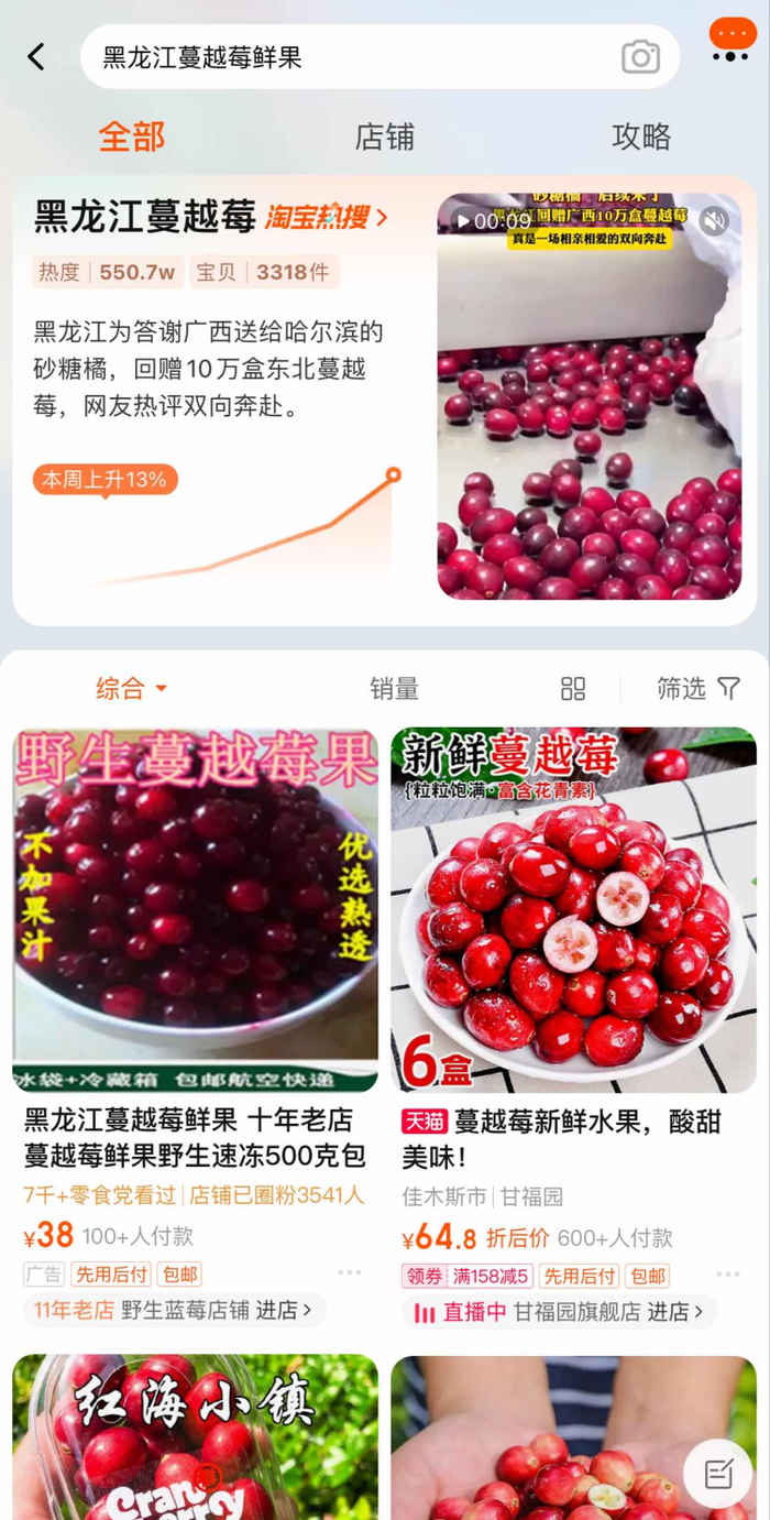 鲜蔓越莓淘宝搜索量激增958%,登上多个直播间,网友:帮黑龙江本地人先尝尝