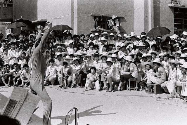 1984年8月29日,游本昌在基层为工人表演哑剧小品《淋浴》 图据视觉中国