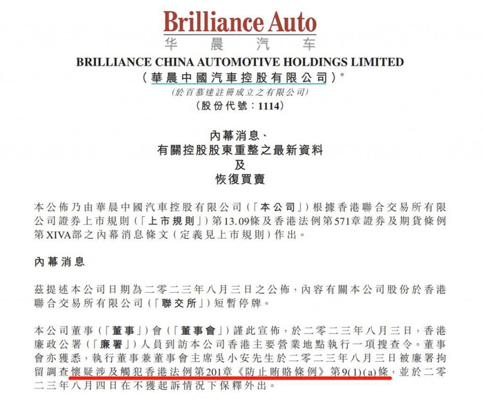 华晨中国公告称,8月3日,香港廉政公署 ( 下称廉署 ) 人员到访公司香港主要营业地点执行一项搜查令。