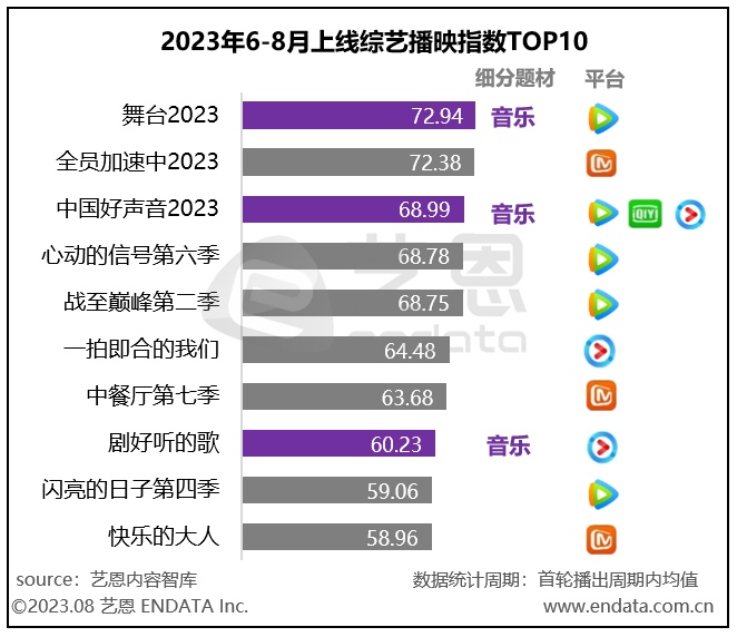 在综艺方面,腾讯独播综艺仍依靠王牌综N代。艺恩内容智库数据显示,2023年6-8月上线的综艺中,腾讯视频《舞台2023》、《心动的信号第六季》、《战至巅峰第二季》等五部综艺强势霸榜播映指数TOP10榜单。