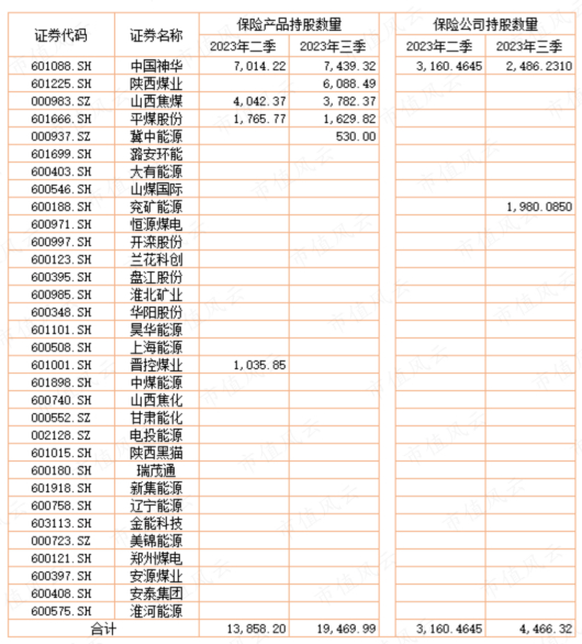 保险资金加仓明显,2023年三季度末,保险产品和保险公司(自营部门)合计持有上表煤炭公司的股票2.4亿股,创2022年以来新高,其中,保险产品持有相关煤炭公司1.95亿股。