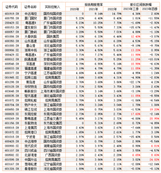 值得注意的是,山东高速、粤高速、深高速、宁沪高速等的股息率较稳定,最近三年均有4.5%以上的股息率,而这些公司在2023年四季度的涨幅普遍不大。