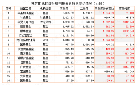 华泰柏瑞基金在、华夏人寿保险、银华基金、南方基金等机构在三季度加仓兖矿能源较多。