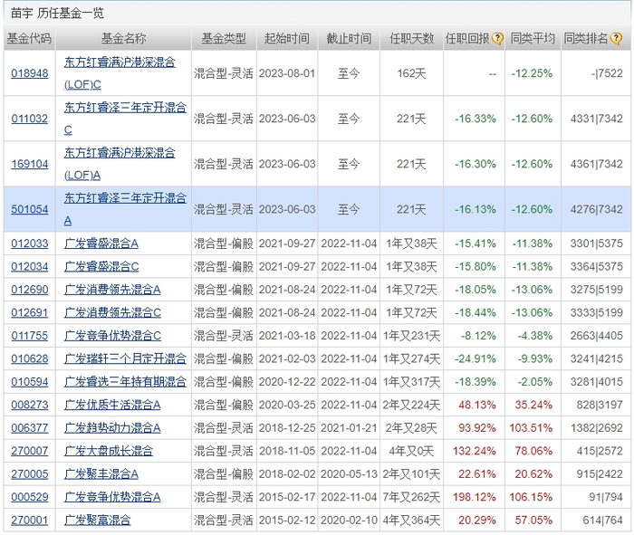 苗宇的资历显示,他于2015年2月开始在广发基金管理产品,到2022年11月离任全部产品,他从2021年开始管理的产品业绩排名处于靠后位置。经过6个月静默期后,他于2023年6月开始在东证资管掌管4只产品,至今业绩表现同类排名也处于靠后位置。