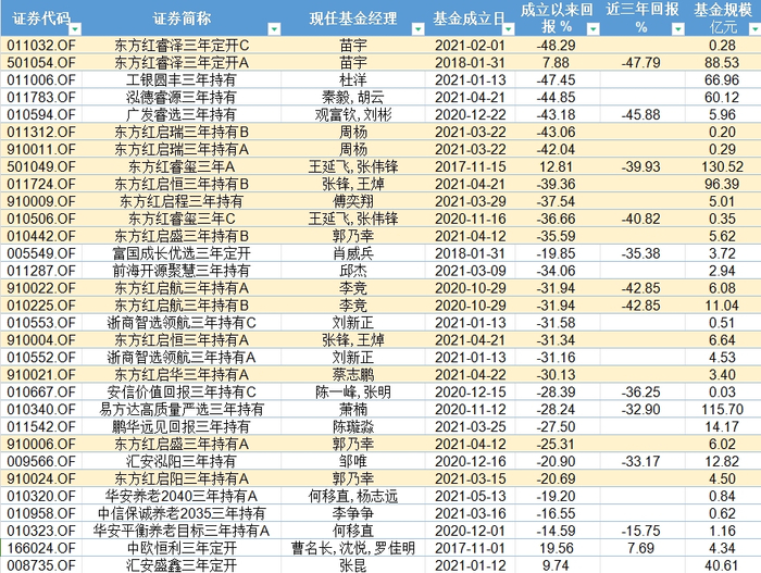 蔡志鹏管理的东方红启华三年持有A、张锋,王焯管理的东方红启恒三年持有、李竞管理的东方红启航三年持有、王延飞,张伟锋管理的东方红睿玺三年、傅奕翔管理的东方红启程三年持有、郭乃幸管理的东方红启盛三年持有 近三年/成立以来收益浮亏超过30%。