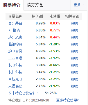 东方红睿泽为灵活配置的混合型基金,业绩比较基准为沪深300指数收益率× 60% +恒生指数收益率×20% +中国债券总指数收益率×20%。三季报显示截至2023年9月30日,前十大持仓合计占比51.25%,重仓股有贵州茅台、五粮液、泸州老窖、腾讯股份、沪电股份、工业富联等。