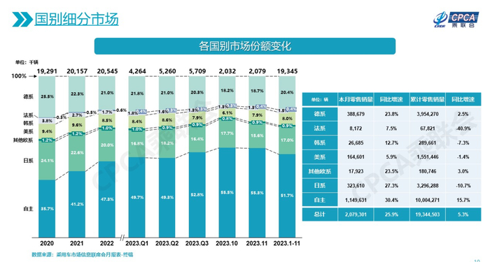 从累计销量来看,2023年1~11月,德系合资品牌同比微增2.5%;日系合资同比下滑10.7%;美系合资同比下滑1.4%;韩系合资同比下滑7.3%;法系合资同比下滑了40.9%。