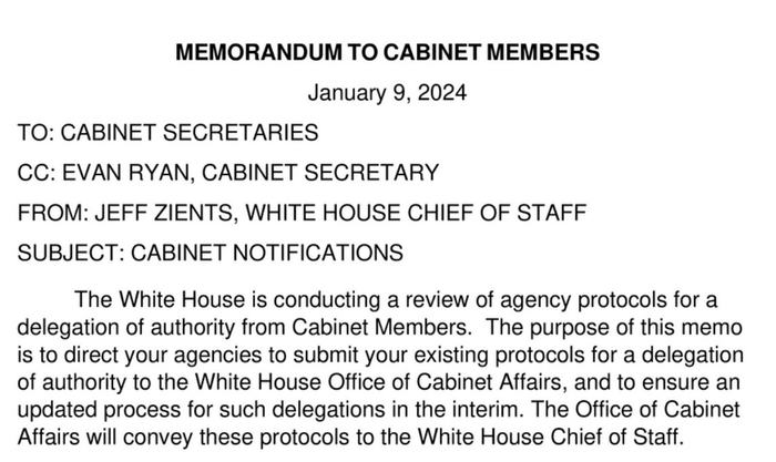 根据媒体拿到的一份备忘录,白宫办公厅主任齐恩茨1月9日通知内阁秘书们,一旦出现职务授权,或者出现潜在的授权委托,需要通知白宫办公厅和内阁事务办公室。同时齐恩茨也要求各部门本周内将各自的授权程序发送给他,以便进行评估。