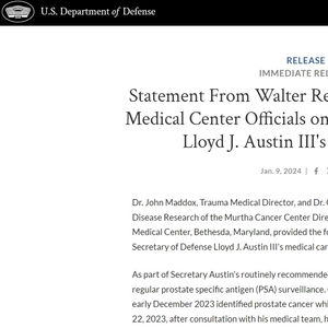 沃尔特·里德国家军事医疗中心的两名医生介绍称,在12月初的检查中,奥斯汀被查出前列腺癌。随后在12月22日,奥斯汀在该医院进行了一次“最小程度的侵入性手术治疗”,或称为前列腺切除术。