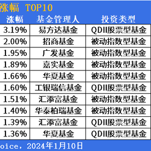 日经225ETF易方达(513000)涨幅居市场首位,达3.19%。另外3只进入涨幅榜前十的QDII产品分别是日经ETF(159866)、恒生生物科技ETF(513280)、恒生医药ETF(159892)。