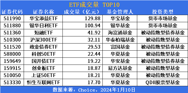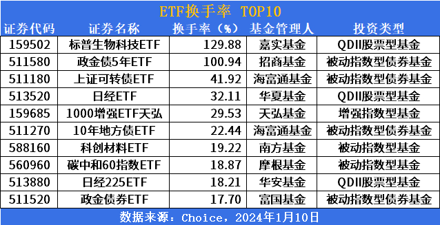 活跃度方面,货币市场基金华宝添益ETF(511990)成交量近130亿元,领跑市场。新上市的标普生物科技ETF(159502)换手率达129.88%。