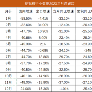 工程机械行业仍处在下行周期中,但多个主要机械产品出现降幅收窄的苗头。以挖机数据为例,2023年前11月国内月度增速均为负增长。1月9日晚,协会发布数据显示,国内挖机结束连降势头,月度数据同比由负转正;出口数据降幅收窄。