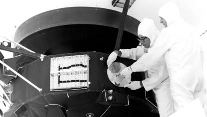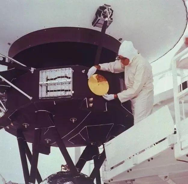 工作人员正在向“旅行者”号探测器上装配“金唱片”