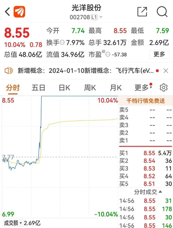 飞行汽车产品走向量产,也刺激了A股二级市场相关概念股。在1月10日早间,光洋股份直线涨停,星源卓镁、商络电子、中信海直等跟涨。