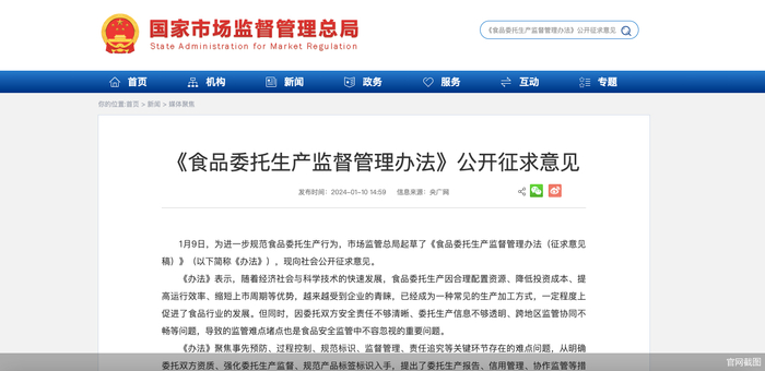 1月10日,国家市场监督管理总局起草了《食品委托生产监督管理办法(征求意见稿)》(以下简称《办法》),向社会公开征求意见。其中提到,特殊医学用途配方食品不得进行委托生产。纳入地方立法管理的食品生产加工小作坊等生产经营主体不得从事食品委托生产活动。根据食品生产许可有关要求,需要完整工艺生产的食品不得委托多个受托方分段生产。委托方不得将同一保健食品分段委托生产。