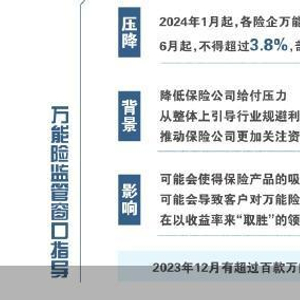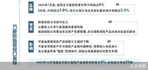 1月10日,北京商报记者获悉,监管近期进行了窗口指导,2024年1月起,各险企万能险结算利率不得超过4%;6月起,不得超过3.8%,部分大型公司及风险处置机构不得超过3.5%。