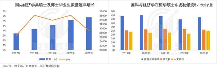 并且,这些学生的水平更加拔群。可以看到,经济学硕士、博士研究生每年正以不小的增速攀升。还有一批人甚至已经卷到了海外:留学机构数据显示,近5年的硕士研究生中,有将近一半是奔着商科、经济学去的。