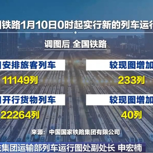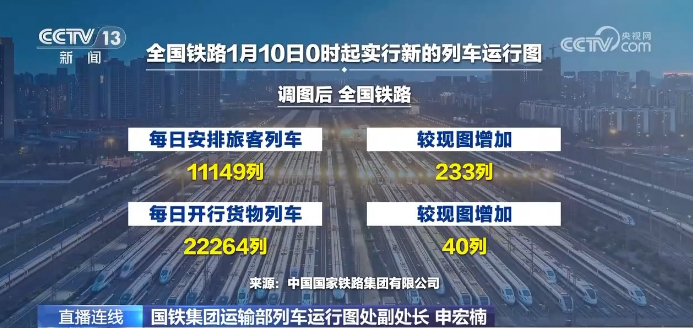 国铁集团运输部列车运行图处副处长申宏楠:新图是于1月10日0时起实施,其实在1月7日已经进入到新图的过渡期。到目前为止,已经有80%的直通旅客列车完成了新旧图的过渡,剩余列车将在13日前完成新旧图的交替,整个交替过程总体来说还是非常平稳有序的。