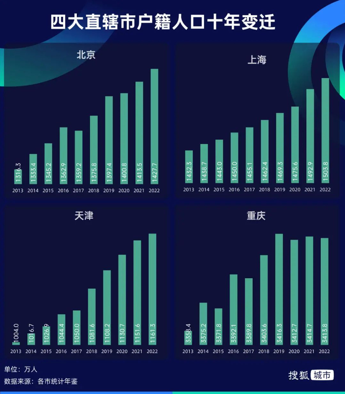 其中北京10年间户籍人口增加111.4万,除2017年有小幅回落,2020年增幅不大之外,其余年份均保持了每年10万以上的增长。落户条件更宽松的天津,10年间户籍人口更是增加了157.3万。反倒是常住人口增势凶猛的重庆,户籍人口数量反复波动,在2015、2017、2020和2022年均出现负增长。