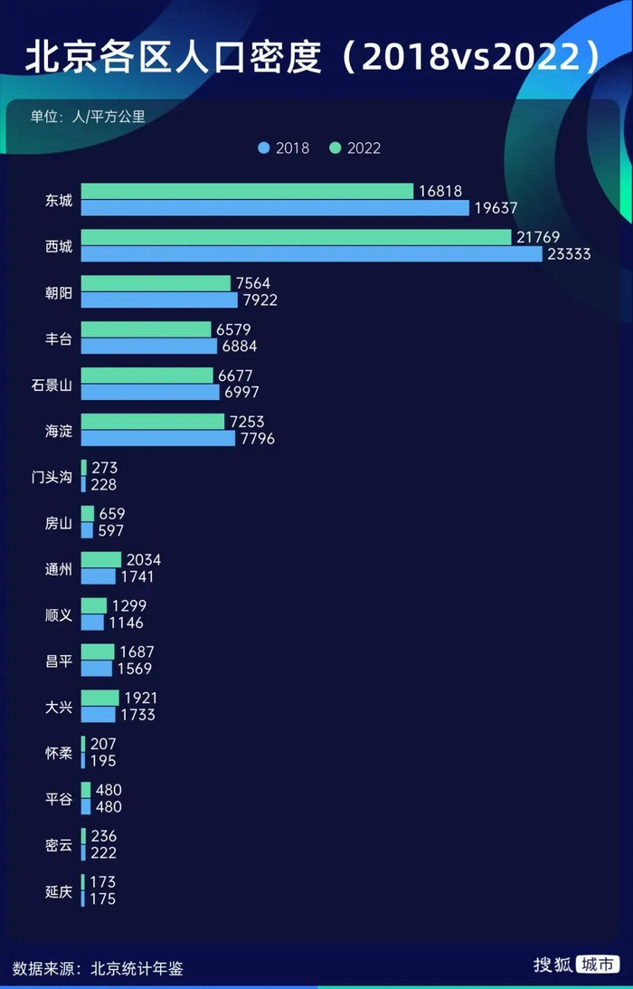 对比2018年和2022年各区人口密度可以发现,城六区均出现明显下降,其中降幅最显著的东城区,人口密度从每平方公里19637人降至16818人,降幅达14%,西城区也从每平方公里23333人降至21769人。