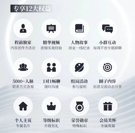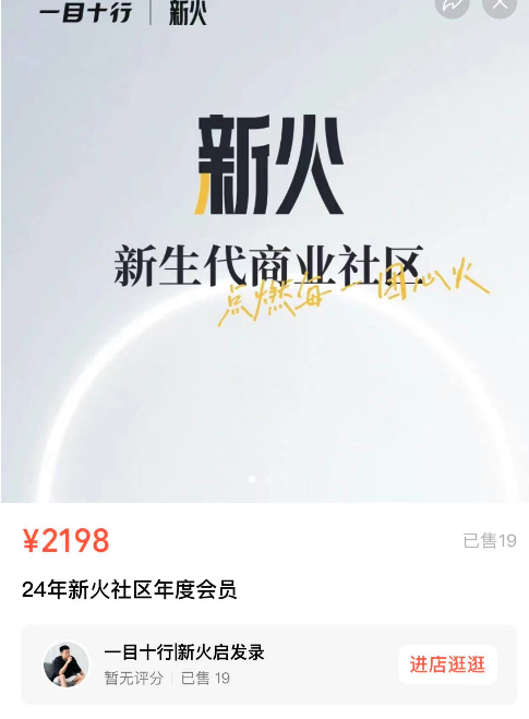 然后就是开始卖会员,记者查询发现, 程前的私域社群会员名为新火社区年度会员,售价2198元一年,购买的用户可以享受程前独家、小群互动、5000+人脉等12项权益,详情页介绍称,会员适用于想学习商业内容、正在创业、需要优质商业资源的人。