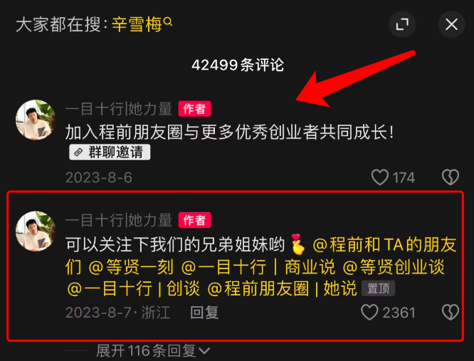 在程前旗下所有矩阵账号的评论区均可以看见引流入口,通过这个入口层层导流最终将添加到一个小助理的微信号,就这样,程前通过矩阵账号将1000万粉丝逐渐转变为私域流量。