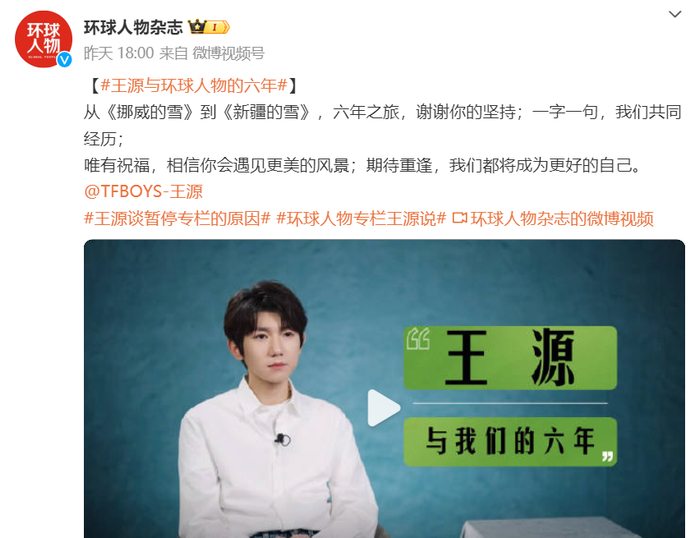 据悉,《环球人物》杂志“王源说”专栏开栏于2018年2月16日,至今已出版71期,将在本月迎来收官。王源是杂志创刊以来,撰稿最久的专栏作家。