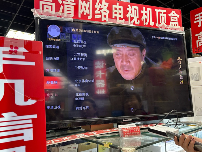 在“我的应用”中,除了常见的CIBN酷喵等视频软件外,还有名为“高清电视”的软件。打开软件后,屏幕上随即开始播放电视节目。销售人员一边按着遥控器,一边介绍:“看,这里有个菜单,中央台、北京台的这些频道都有。”