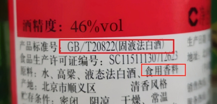 其他固液法酿造的非纯粮食白酒,配料表含有食用酒精或食用香料等字样,无论吹得再天花乱坠,都不可信,准是酒精酒!
