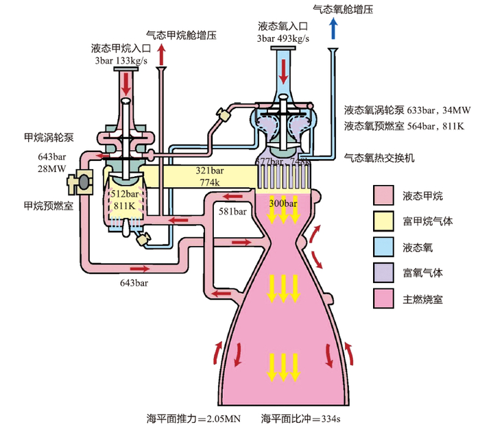 “猛禽”发动机的具体性能如表2所示,其推力大约是SpaceX用于“猎鹰”9的“梅林”1D发动机的3倍,海平面版和真空版发动机的比冲也分别达到了334s和378s。“猛禽”发动机是一款甲烷分级燃烧发动机,采用了复杂的全流量分级燃烧循环,氧化剂和燃料分别由各自的涡轮机供压,部分推进剂通过管道互相交换,分别燃烧驱动涡轮机,详见图15。这种设计使得涡轮机的工作温度更低,因而发动机的寿命得到延长,效率也更高。