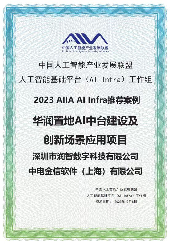 与华润置地共同打造的AI中台项目被中国人工智能产业发展联盟AIIA评为推荐案例