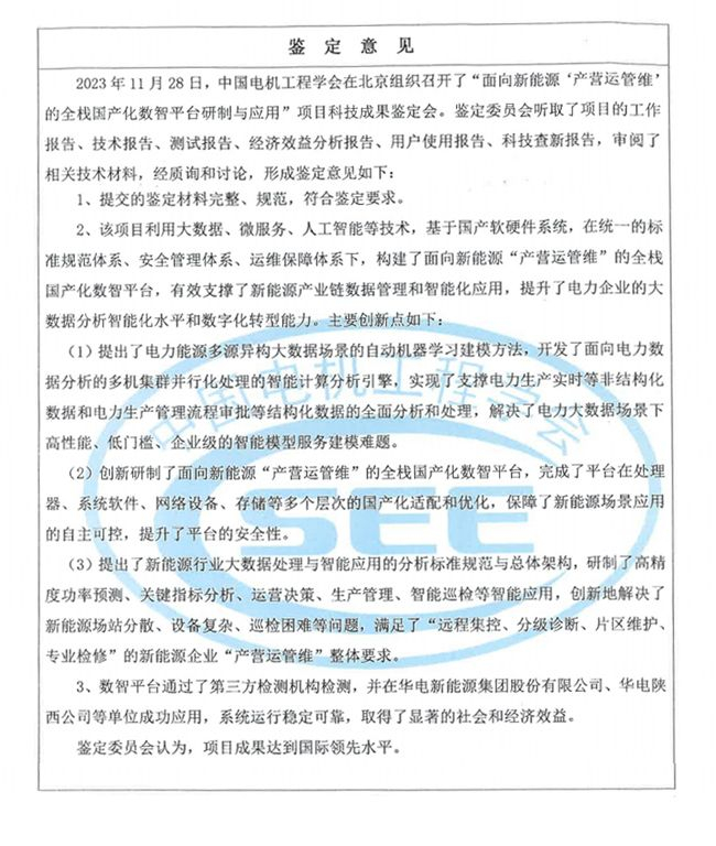 中电金信联合国电南自利用源启·行业AI平台的基础技术支撑,结合大数据、微服务等技术,基于国产软硬件系统,在统一标准规范体系、安全管理体系、运维保障体系下,构建了面向新能源“产营运维管”的全栈国产化数智平台,完成针对电力设备运行的智能预警算法在线建模、训练和优化,实现运行状态异常检测及预警,预测设备劣化程度,提高设备运行可靠性。该平台有效支撑了新能源产业链数据管理和智能化应用,提升了电力企业的大数据分析智能化水平和数字化转型能力,经中国电机工程学会鉴定,项目成果达到国际先进水平。