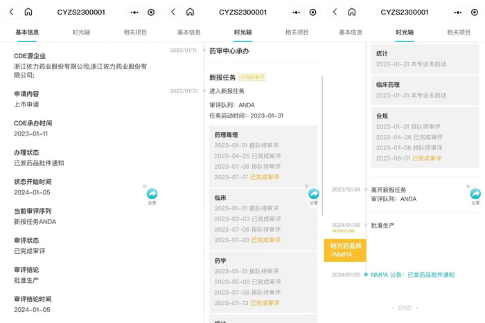 据丁香园Insight数据库,2023年1月11日,国家药品审评中心承办了佐力药业的百令胶囊项目。其审评内容包括药理毒理、临床、药学、合规部分,但并没有启动临床药理。同时,前述部分的完成审评的时间大都集中在2023年8月前。截至今年1月5日,这一产品被批准生产,由此形成了当前正式获批的局面。