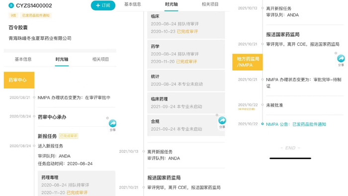 珠峰药业的百令胶囊项目在2020年8月24日进入新报任务序列。随后,这一项目的临床、药学部分在当年10月和11月底完成审评。但是,珠峰药业的项目在2021年10月报送至国家药监局之后,得到了“未被批准”的审评结论。