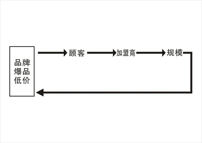 加盟模式的茶饮品牌其盈利模式如图所示,形成这样一个正向循环:品牌通过低价、爆品吸引更多顾客,让潜在加盟商意识到加盟该品牌是一门不错的生意,加入该品牌,门店数量扩大,品牌收入增长、成本摊薄,在新品研发、销售价格上保持强劲竞争力,吸引更多顾客。