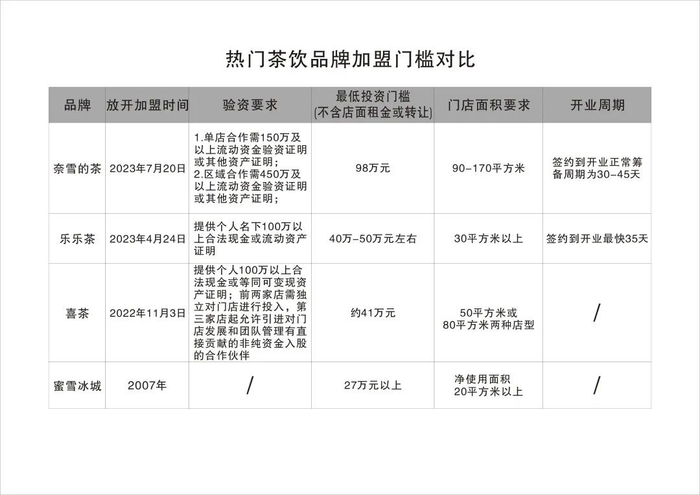 也可能存在这样的问题,喜茶、奈雪的茶等品牌开放加盟下沉的时候,对加盟商有更高的要求,需要验资、需要在门店接受3个月的全职培训考核等。整体估算,奈雪的茶最低前期投入在200万元左右,喜茶在90万元左右,乐乐茶在70万-80万元左右,蜜雪冰城约47万元。