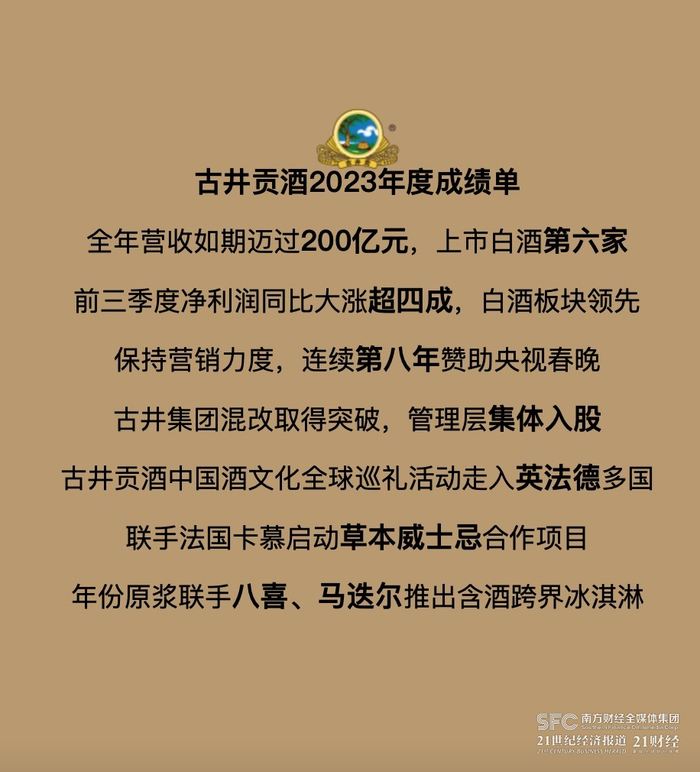 2023年最后一个工作日,《2024致全体员工的一封信》如期而至。古井集团党委书记、董事长,古井贡酒党委书记、董事长梁金辉在信中宣布,2023年古井人即将成功跨越200亿。