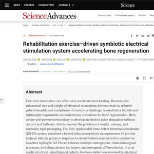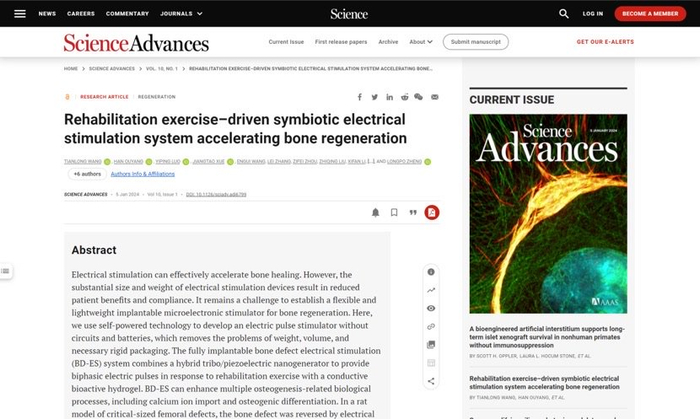 日前,国际著名学术期刊《科学进展》(Science Advances)在线发表了中国学者的研究论文Rehabilitation Exercise-driven Symbiotic Electrical Stimulation System Accelerating Bone Regeneration(《康复运动驱动的共生电刺激系统加速骨再生》),这是同济大学附属第十人民医院郑龙坡教授团队、中国科学院纳米能源所李舟教授、复旦大学附属口腔医院陈峰研究员/曹文涛副研究员和中国科学院大学欧阳涵副教授团队合作诞生的研究成果,创新性应用微型植入式共生电子器件,利用人体自身康复运动供能,无需电池供电和电路调制,就能够提供稳定可控电刺激的共生体系,从而促进骨修复。