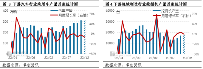 挖掘机是我国工程机械市场中规模最大,且施工顺序靠前的产品,和汽车均属于钢材主要的下游消费终端行业。2023年四季度汽车及机械制造业不断回暖,且2024年一季度表现或偏强运行。2023年宏观上政策、资金等多方面向好举措不断落地,提振了市场信心,汽车行业针对性的增换购促销和地方补贴,推动了市场消费者购车需求释放;涉及到公路、桥梁、水利、铁路、城市轨道交通等基础设施建设的工程机械购置、运输、租赁等方面也可以享受到相关政策的扶持。另外,2023年四季度国家发行1万亿特别国债,同时地方2万亿专项债也提前投入使用,为2024年需求回升打下了良好的基础。