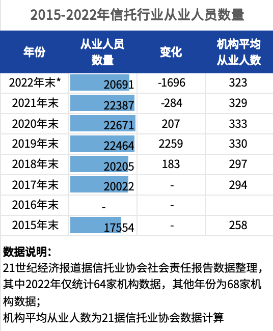 从信托业协会披露的数据来看,近两年信托行业从业总人数有所下降,从机构均值来看也出现了缓慢下行的趋势。至2022年末,行业从业人数仍维持在2万人以上。