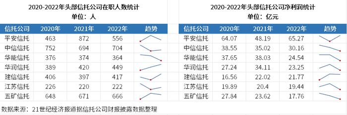 21世纪经济报道记者注意到,近年来,信托行业从业人数正逐步减少。中国信托业协会发布的《中国信托业社会责任报告(2022-2023)》显示,截至2022年末,64家信托公司共有员工20691人,较2021年末的22387人下降1696人。结合财报数据来看,多家头部信托公司也在近年来出现“减员”,与此同时部分公司净利润也出现下滑。