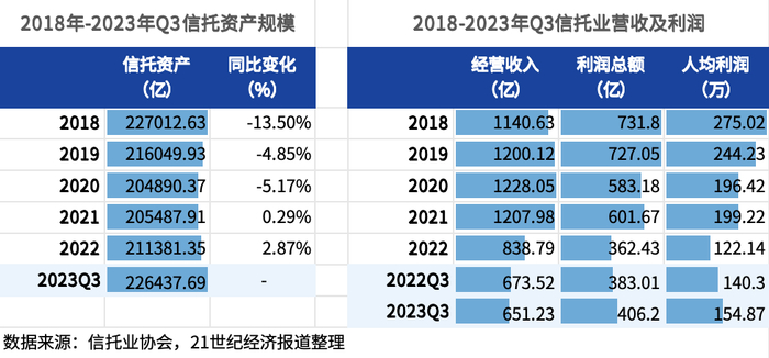 从信托资产规模来看,尽管截至2023年第三季度已连续6个季度实现正增长,但从信托公司的营收和利润情况来看,与此前几年仍有较大差距,人均利润也不如从前。从单家机构此前披露的2022年财报数据来看,不同机构业绩分化的趋势同样明显,同时多家信托公司都面临营业收入、净利润大幅下滑的“窘境”。
