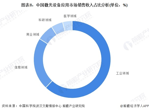我国激光设备主要应用在工业、信息、商业、医学以及科研领域。根据中国科学院武汉文献情报中心数据显示,2021年工业领域激光设备市场占比最大,达62%,其次为信息领域激光设备市场,占比达22%。